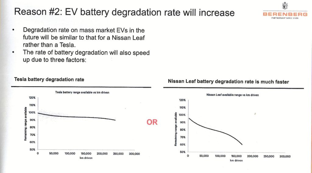 The shorter life expectancy will come as a surprise to those who believe all EV batteries will behave in a manner similar to that of Tesla Inc.’s big, actively cooled lithium-ion battery packs, Farid said. He predicted that many future batteries will exhibit the kind of “capacity fade” that Berenberg chronicled in early Nissan Leaf EVs. Those batteries exhibited more than 20% degradation after an average of five to six years of driving, he noted.