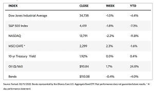 Volatility marked this week’s trading which saw large-cap indexes end lower and the S&P MidCap 400 and small-cap Russell 2000 indexes treading water with modest gains. Underperforming the rest was the technology-laden Nasdaq Composite Index that ended the week down 15% from its recent high and ending in correction territory. Investor sentiment continues to be dominated by the clash between robust earnings growth and worries about the impending monetary tightening. The possibility of a Russian invasion of Ukraine overshadows speculations, causing a sell-off at the week’s end. Pulling down the broader indexes early in the week were declines in the large-cap technology stocks such as Google parent Alphabet, Facebook parent Meta Platforms, and Microsoft, although lost ground was recovered by the middle of the week. Counters in the hospitality sector such as hotels, restaurants, casinos, online travel agencies, and air and cruise lines rallied with the continued opening of the economy.