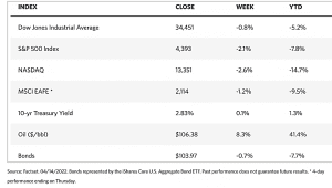Over the holiday-shortened week, the benchmark indexes closed mixed, with the first corporate earnings reports of 2022 being released. Growth stocks continue to be outperformed by their value counterparts, although the small-caps recovered territory lost during the previous week to large-caps. Within the S&P Index financials fell behind, weighed down by JP Morgan Chase which missed the targets set for it by Wall Street. On the other hand, energy shares outperformed the market during the truncated four-day trading week. Markets were closed on Friday as the world observed Good Friday. Investors’ attention was likely drawn to their holiday plans as the markets saw below-average trading volumes for the entire week.