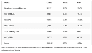 Last week marked the sixth consecutive weekly decline for both the Nasdaq Composite and the S&P 500 Index and the seventh for the Dow Jones Industrial Average (DJIA). The S&P 500 descended to almost 18% off of its peak at its low point on Thursday. This level confirms that the market is well into correction, and is only 2% above the performance threshold of a bear market (i.e., -20%). The benchmark indexes recovered somewhat their losses by Friday, on the back of a rally in Tesla shares when CEO Elon Musk announced that his deal to buy Twitter was “on hold.” This purchase is going to be partly funded by a sale of a portion of Musk’s considerable stake in the electric car manufacturer.