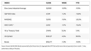 Part of the previous week’s strong gains was given up during this week’s trading, despite being only a four-day trade week due to Monday being Memorial Day. Investors continue to remain uncertain as to whether the Federal Reserve will be able to rein in inflation without pushing the economy into a full-blown recession. The industrial sector outperformed the rest of the market-driven by a rise in Boeing. Furthermore, gains in Amazon shares boosted consumer discretionary shares which also proved resilient. Volatility proceeded moderately as expected, although analysts expect the economy to become progressively destabilized by the rising interest rates and elevated commodity prices. On Friday, Elon Musk emailed his fellow executives that 10% of Tesla’s workforce may be laid off and that he had a “super bad feeling” about the global economy.
