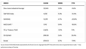 All attention was focused on the week’s Federal Open Market Committee (FOMC) meeting that ended with the announcement of a 75-basis-point rate increase on Wednesday. The announcement was generally expected, and thus was quickly discounted by investors, having priced in the restrictive measures in past weeks’ trading. Some softening of spending and manufacturing was noted in the FOMC statement, and Fed Chair Jerome Powell’s post-meeting press conference was mostly interpreted by market participants as more dovish than expected. The stronger-than-expected quarterly earnings reports from Amazon.com and Alphabet resulted in a one-day gain of more than 4% for the Nasdaq Composite Index.