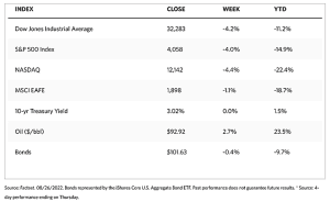 Stocks were driven sharply lower this week due to concerns that the Federal Reserve may not be able to control inflation without further aggressive rate hikes. Investors fear that further increases in interest rates may well cause a significant economic slowdown. The Dow Jones Industrial Average (DJIA) plunged 4.22% while the total stock market lost 3.84% of its value. The S&P 500 Index gave up 4.04% while the Nasdaq Stock Market Composite lost 4.44%. The NYSE Composite slid 2.63%. The underperformance by the Nasdaq, which fell to its lowest level in a month, compared to the other stock market indexes suggested that technology and other high-growth stocks fared worse in this slowing environment. The rising price of oil further drove inflation worries, but also boosted the energy sector.