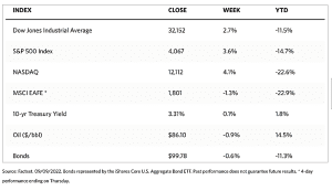 After a streak of three consecutive weekly losses, stocks rebounded this week, a sign that investors are gaining confidence that the market may have temporarily bottomed out after retracing half of its summer gains. Inflation concerns appear to have been moderated with the expectation that the Fed’s future hawkish measures may be tempered. Energy shares underperformed the other sectors due to a midweek decline in oil prices, which briefly descended to their lowest level since the Russia-Ukraine war broke out; nevertheless, the sector still registered a modest gain for the week. The consumer discretionary sector outperformed the market due to a rally in heavily-weighted Tesla.