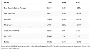 There were few economic reports released during the week to provide much impetus for strong market movement. As expected, many investors remained sidelined as a prudent move before the start of 2023. Investors and analysts are keeping a close watch on the global impact of China’s relaxation of COVID containment rules even as the data shows that concerns of rising infection rates might usher back loosened pandemic restrictions.