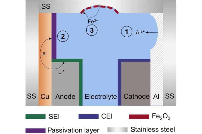Having surveyed the scientific literature on the topic, the authors concluded that corrosion reactions in Li batteries primarily involve three aspects: the electrochemical corrosion of aluminum current collector, electrochemical corrosion of the stainless-steel case that encloses the battery, and the galvanic corrosion (when one metal corrodes more than another metal with which it is in electrical contact, and both are immersed in the electrolyte solution) of the anode. Ultimately, the corrosion originates with the chemical and electrochemical reactions between electrode materials and the electrolytes.