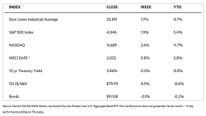 The yield on the benchmark 10-year U.S. Treasury note pulled back from a new three-month intraday high of 4.09% on Thursday and ended the week only slightly higher. This may be attributed to the comments by Atlanta Federal Reserve President Raphael Bostic that he still supported only a quarter-point rate increase at the Federal Reserve’s upcoming policy meeting despite the hot inflation data released the previous week. Bostic further stated that the Fed may be in a position to pause further rate hikes by mid to late summer. These developments appear to check at least one of the three boxes required to support a sustainable market recovery: (1) that inflation should start to descend, (2) that the Federal Reserve pause its rate-hiking cycle, and (3) that earnings revisions start to bottom.