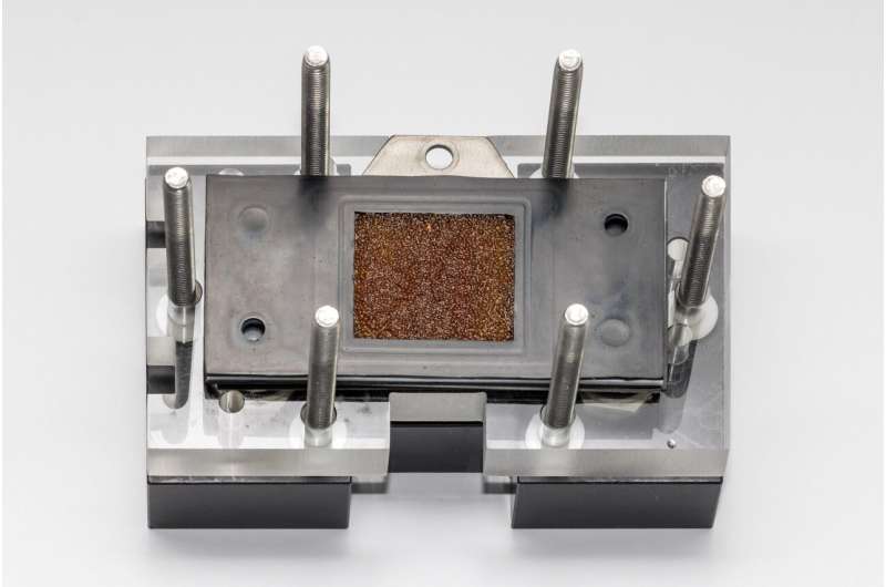 Thanks to a clever anode design, the researchers were also able to completely omit the electrolyte chamber between the membrane and the anode. For the stack, the positive and negative electrodes, cathode and anode, of adjacent cells were replaced by a single component (the bipolar plate) that connects two cells..