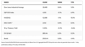 Pessimistic statements from a Federal Reserve official and a leading bank executive also weighed down investor sentiment. At an economic conference, Cleveland Fed President Loretta Mester disclosed that she expected the federal funds rate to go above 5% and remain at that level, while JPMorgan Chase Chairman and CEO Jamie Dimon warned in a letter to shareholders that the banking crisis is not yet over and “that there will be repercussions from it for years to come.” The weak economic data push U.S. Treasury yields lower, and, since bond prices and yields move in opposite directions, bond prices moved up. Bonds in the energy sector were early outperformers on news of a production cut by OPEC and other oil-producing nations, while U.S. and Yankee banks – banks domiciled in the U.S. but with most of their operations abroad – lagged the broader market.