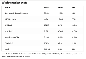 The negative developments during the week were the Federal Reserve interest rate hike of 0.25%, the ongoing turmoil in the banking system, and a key jobs report for April. The Fed may finally be considering a pause in its rate-hiking policy after raising interest rates by more than 5.0% in slightly over a year, however, the past year’s rate hikes may only now be starting to impact the real economy. Market volatility may increase following a market really, though it may be characterized by thin equity leadership. A bull market in stocks and bonds is still possible by year-end as the ongoing bear market loses its steam.