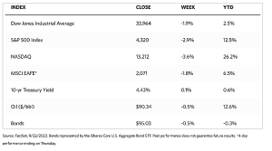Additionally, investors are concerned about the repercussions of the United Auto Workers’ strike that began with three plants on September 15 and has now expanded to include 20 states nationwide. There is also the potential that the U.S. government will shut down for failure to pass the 12 annual appropriation bills that fund government operations before the current fiscal year ends on September 30. The market sell-down may also have been worsened by tax-loss harvesting before the fiscal year-end. The Fed maintained its short-term lending benchmark rate at a target level set during the previous meeting in July of 5.25% to 5.50%. The market was surprised, however, when policymakers declared an outlook for rates in 2024 that was significantly higher than expected, with a correspondingly higher rate prediction for 2025. The Fed raised its growth forecast which is an admission that the economy has been more resilient than expected.