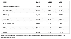 The switch to a dovish outlook by the Fed suggested that the recent rise in long-term Treasury yields had achieved at least some of their intended tightening in financial conditions. The recent upside surprises in economic data also appeared to have satisfied the Fed which tweaked its description of the pace of economic growth from “solid” to “strong.” The closely watched payrolls report released on Friday appears to confirm that the labor market was cooling, which the market hopes to be soon followed by wage pressures. Some 150,000 jobs were added by employers in October, a number which was below expectations and the lowest level since June. September’s strong gain was also revised lower, and the unemployment rate rose to its highest level since January 2022 at 3.9%. \