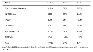 As traders returned from an extended Christmas break and only a few days left in the year, trading volume was light but equities were higher for the last trading week of the year. The pan-European STOXX 600 Index gained 0.41% on heightened optimism that interest rates may be reduced next year. The region’s major stock indexes were mixed. Germany’s DAX gained a modest 0.22% while France’s CAC 40 and Italy’s FTSE MIB hardly changed. The UK’s FTSE 100 ascended by 0.66%. Spain, the first major eurozone economy to report December inflation, released a preliminary estimate of consumer price growth and it showed headline prices slowing in December to 3.1% year-over-year. This is a happy surprise in place of the acceleration to 3.3% initially expected by economists. FactSet, the national statistics agency, attributed the price slowdown to a fall in motor fuel prices. A European Central Bank (ECB) official, Madis Muller, announced that the ECB is not likely to raise interest rates again in light of the slowing inflation.