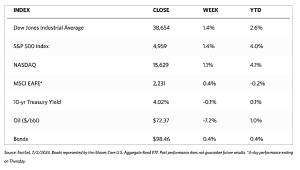 Several releases from tech heavyweights drove movements in the major indexes during this, the busiest week of the fourth-quarter earnings reporting season. In response to lower-than-expected earnings guidance from Google parent Alphabet, Microsoft, and chipmaker Advanced Micro Devices, the Nasdaq Composite Index and the S&P 500 Index plunged precipitously on Wednesday. On Thursday, however, the benchmarks recovered much of their losses, buoyed by the stronger-than-anticipated earnings reports from Facebook parent Meta Platforms, Apple, and Amazon.com. Also seeming to sway sentiment was the Federal Reserve policy meeting that concluded on Wednesday. Short-term interest rates were left unchanged by the policy-making body, which broadly aligned with expectations. However, Fed Chair Jerome Powell stated that the Fed was unlikely to cut rates in March, which resulted in futures markets pricing in only 20.5% (from 47.7% one week earlier) of a rate cut at the Fed’s next policy meeting.