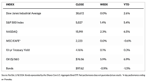 During a holiday-shortened week, Chinese stocks rallied in response to the government’s latest series of stimulus measures released to allay concerns about deepening deflation. The Shanghai Composite Index gained by 4.97% and the blue-chip CSI 300 advanced by 5.83% for the four-day trading week. Markets in mainland China remained closed for the Lunar New Year holiday on Friday, February 9, and will continue to remain closed for the next week. Trading at the exchanges will resume on Monday, February 19. The Hong Kong benchmark Hang Seng Index rose by 1.37% for the week. China’s consumer price index fell by 0.8% in January from the prior year period. This is an acceleration from the CPI’s 0.3% drop in December and marks its fastest decline since 2009. Leaning the contraction are food prices, particularly that of pork. Core inflation (which excludes volatile components food and energy costs) rose by 0.4%, its weakest rise since June 2023. The producer price index slipped by 2.5% year-on-year, marking the 16th consecutive month of deflation for factory gate costs.