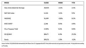 European stocks descended this week as the pan-European STOXX Europe 600 lost by 1,19% in local currency terms during the holiday-shortened trading week. The drop interrupted 10 consecutive weeks of gains, attributable to investor reactions to hawkish comments from some U.S. Federal Reserve policymakers. Higher crude oil prices also heightened doubts about the timing of anticipated future interest rate cuts. Italy’s FTSE MIB plunged by 2.13%, France’s CAC 40 Index lost 1.76%, and Germany’s DAX dropped by 1.72%. The UK’s FTSE 100 Index slid by 0.52%. The headline inflation in the eurozone slowed down more than expected to 2.4% in March from 2.6% in February. Also decelerating was core inflation, which excludes volatile food and energy prices, from 3.1% to 2.9%. However, the year-over-year increase in service prices came in at 4.0% for the fifth straight month. The economic data suggests that after stagnating for the past year, the economy may be picking up. S&P Global revised its forecast, from 49.9 to 50.3 in March, for the eurozone’s composite purchasing managers’ index (PMI) which includes manufacturing and services. This is significant because a reading north of 50 indicates expansion in private-sector business activity.
